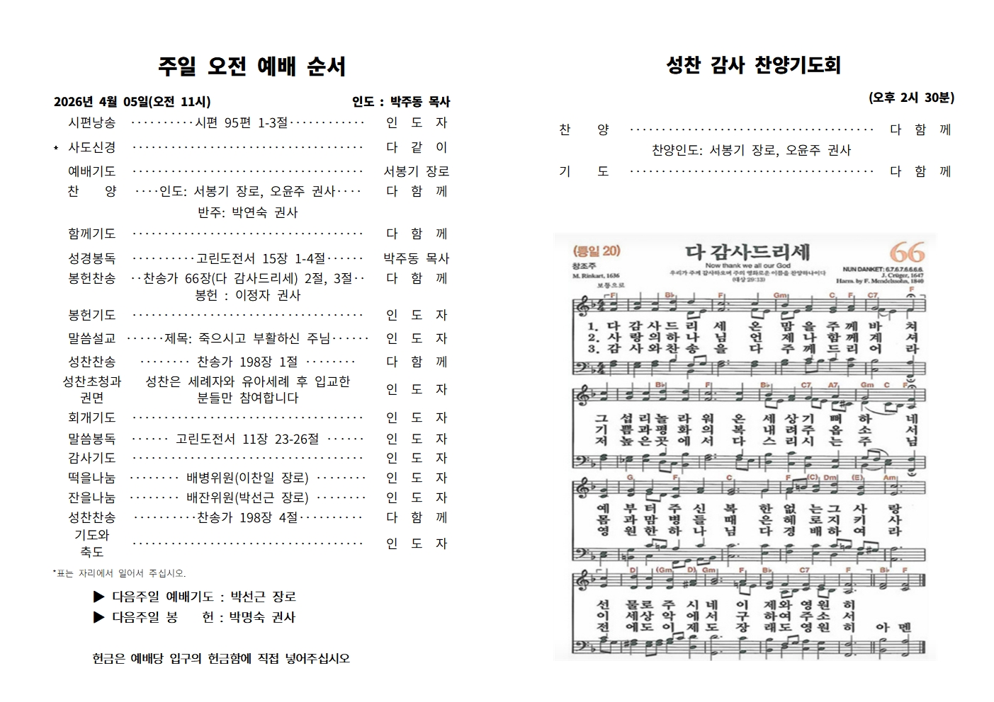 봉헌 찬송  • • • •  찬송가 66장(다 감사드리세) 2절과 3절• •  (봉헌 이정자 권사) • • 다함께