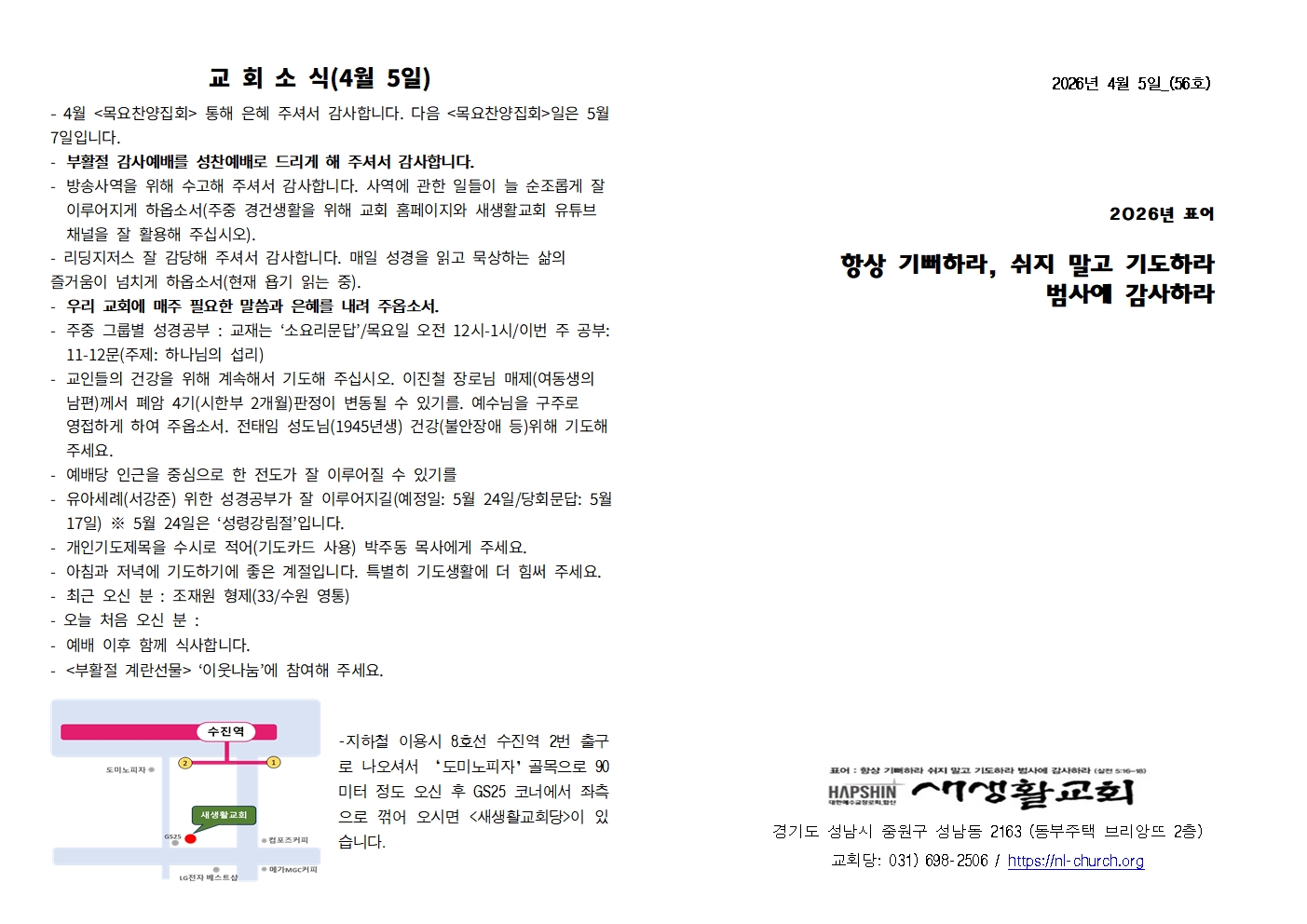 2026년 표어 : 항상 기뻐하라, 쉬지 말고 기도하라, 범사에 감사하라